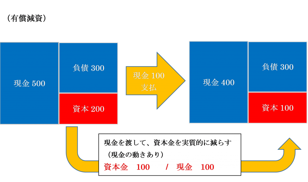 ひとつめは「有償減資」。これは、会社の規模・事業内容と資本金を比べて「資本金のほうがあまりに大きい」と判断した場合に、余剰資金分を株主に払い戻すことです。有償減資は実質上の減資であり、会社の財産が確実に減少します。