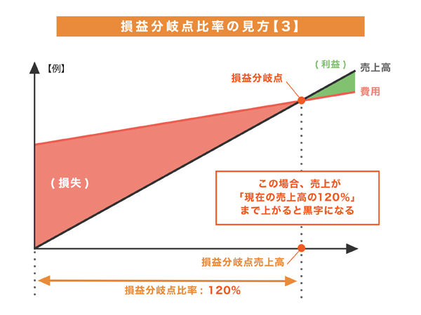 例えば、損益分岐点比率が120%だとします。この場合、売上が「現在の売上高の120%」まで上がると、黒字になるということです。