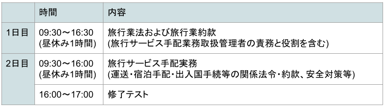 下記の表は、2022年のスケジュール内容です。旅行サービス手配業務取扱管理者の研修を受講しようと考えている方は参考にしてください。